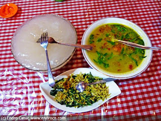 papeda disajikan dengan ikan kuah kuning dan sayur kangkung buah pepaya |