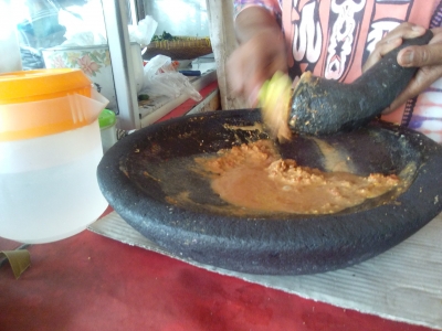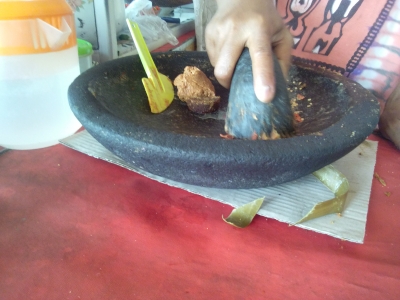 Sambal: 60 gram kacang tanah 25 gram gula merah, 20 gram minyak, 1 siung bawang putih, garam, cabai.