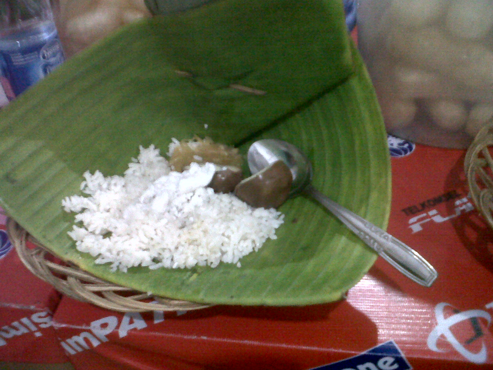 Menu yang tersedia pastinya nasi liwet. Kita bisa memesan sesuai selera mau pakai ayam, tempe tahu bacem, telor dan lain sebagainya. Teman saya memesan nasi liwet paket komplit (Rp.15rb) dengan sepotong ayam sedangkan saya memilih menu nasi liwet pake telor doank (Rp.10/5rb yah kalau gak salah). Tak berapa lama memesan, nasi liwet tersebut langsung tersaji di dalam daun pisang. Bau kelapa dari nasi tersebut sangat terasa dan saya paling suka arehnya. Bentuknya mirip putih telur gitu tapi sedikit asin dan gurih. *Nyam nyam*