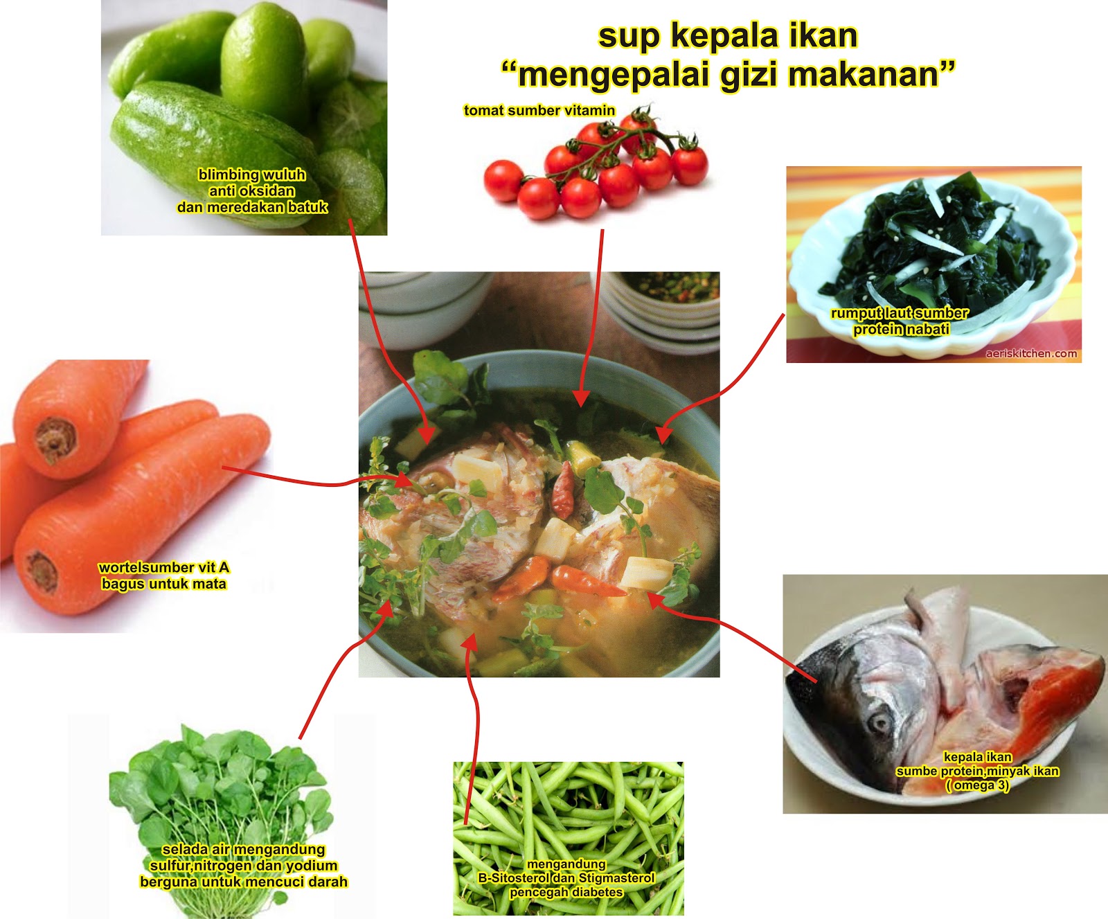 Ups… anda jangan terburu-buru menghakimi saya apalagi kedua masakan yang sangat spesial ini, tahukah anda ? bahwa dari semua bagian tubuh ikan bagian kepalalah yang memberikan sumbangsih gizi terbaik, Kandungan asam lemak tak jenuh pada ikan lebih banyak tersebar pada bagian daging ikan yang berwarna kemerahan (bagian kepala). Bagian yang kemerahan ini akan berubah menjadi kehitaman saat dimasak, Sayangnya, karena ketidaktahuan, konsumen atau penjual justru sering membuang bagian ini dengan alasan estetika dan cita rasanya yang lekas tengik akibat kandungan lemaknya yang tinggi. Makin mendekati bagian kepala, kandungan asam lemak tak jenuhnya makin tinggi. Itulah yang membuat kepala ikan, seperti kepala ikan salmon atau kepala ikan kakap,Gurami dan Nila begitu disuka. Bagian yang lebih berlemak akan memberi rasa yang lebih gurih dan lezat,kemudian kenapa harus di sup ? sebenarnya banyak sekali resep masakan kepala ikan mulai dari gulai,soto dan santan namun resep sup adalah yang paling baik karena gizi yang terkandung tidak hilang akibat dimasak dan juga gizi sayuran yang terdapat dalam masakan sup membantu melengkapi gizi sayuran dalam resep ini