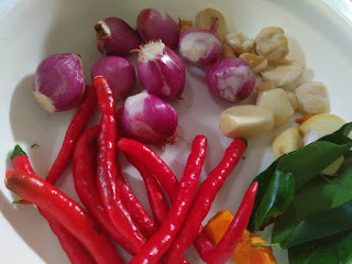 Tumis bumbu yang dihaluskan hingga harum. Tambahkan daun salam, lengkuas dan temu kunci, tumis hingga layu. Masukkan santan encer dan asam muda, biarkan mendidih.