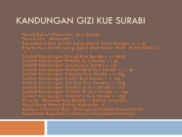 Ya, surabi atau serabi, siapa yang tak kenal dengan panganan yang satu ini, kue yang terbuat dari tepung beras dan santan ini memiliki bentuknya mirip dengan pancake. Bedanya kalau surabi dimasak di atas tungku berisi arang dengan memakai wajan yang terbuat dari tanah liat. Rasanya gurih dan legit dan bila menginginkan rasa yang manis bisa ditambahkan ‘kinca’ yaitu larutan gula merah. O ya ternyata surabi ini terdapat di berbagai daerah di nusantara tercinta. Surabi yang terkenal adalah Surabi Bandung, Jakarta, Purwokerto, Pekalongan dan Solo, tiap daerah memiliki kekhasannya tersendiri.