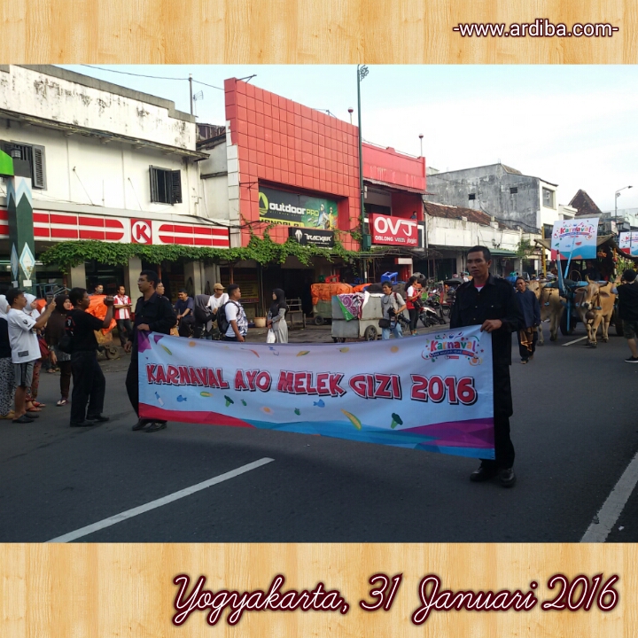 Acara Karnaval Ayo Melek Gizi 2016 ini diselenggarakan oleh Sari Husada dan Pergizi Pangan dalam rangka Hari Gizi Nasional yang jatuh pada tanggal 25 Januari. Sebelum pembukaan acara ada kegiatan senam bersama, dan acara pagi itu dimulai sekitar pukul 7 pagi. Acara Karnaval Ayo Melek Gizi diawali dengan kegiatan Fun Walk seluruh peserta Karnaval Ayo Melek Gizi dari Kantor Dinas Pariwisata menuju keMonumen Serangan 1 Maret. Arak-arakan fun walk miripGrebeg Sekatendimana ada rombonganpasukan Bergodo Keraton, Pasukan Srikandi, Sepeda Ontel, tumpeng besar yang penuh berisihasil bumi yangbergizi, dan yang unik ada gerobak berisi sayur-sayuran dan buah-buahan yang ditarik sapi yang gagah. Gerobak plus sapinya ini kemudian ‘diparkir’ di lokasi parkir Benteng Vrederburg. Nah, disini baru deh acara sebenarnya dimulai!