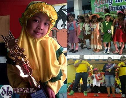 “Buah jatuh tak jauh dari pohonnya”. Pepatah itu seolah berusaha ingin saya rubah. Maunya sih nurun yang baik-baiknya saja. Sadar kalau saya dan suami mempunyai sifat yang pemalu, saya berusaha keras agar pepatah itu tak sama persis menurun ke Vica. Tak ayal, saya mencoba mengarahkan Vica untuk mengikuti berbagai perlombaan, baik yang diadakan di sekolah maupun di luar sekolah. Beruntung sejak playgroup Vica selalu terpilih diikutsertakan dalam berbagai perlombaan di sekolah. Seperti lomba bercerita, membaca doa, drumband, mewarnai, dan paduan suara. Namun jika diluar sekolah, saya tetap harus aktif merekomendasikan Vica untuk mencoba mengikuti perlombaan lainnya, misalkan lomba fashion show. Ini supaya melatih Vica berani tampil dimuka umum, mandiri dan penuh percaya diri. Syukurlah, ternyata Vica suka dan berbakat. Beberapa piala telah diraihnya. Hingga kini selalu menanyakan kapan bisa ikutan lomba lagi.