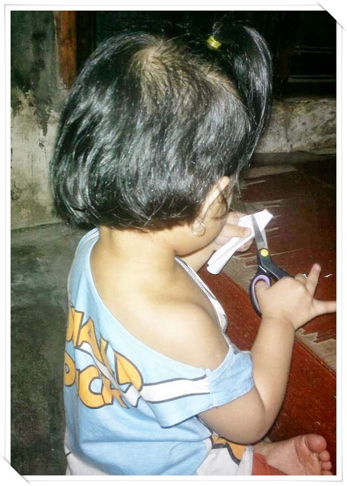 Cerita lain, ketika Sri Mulyani melihat gunting tergeletak. Benar saja, dia mengambilnya dan kebingungan sendiri bagaimana menggunakannya. Mungkin beberapa Ibu akan serta merta melarang anak memegang gunting dan menyuruhnya segera meletakkan gunting itu. Tapi saya penasaran, apa jadinya kalau saya biarkan. Saya mendekatinya,