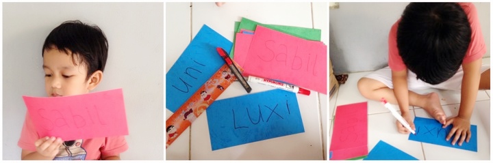 - Ciptakan lingkungan belajar yang mendukung. Lingkungan belajar yang nyaman akan membantu anak untuk lebih fokus belajar meski pun sesi belajar hanya sebentar. Anak-anak biasanya hanya bisa konsentrasi dalam jangka waktu yang tidak terlalu lama dan biasanya mereka sangat visual, jadi, alat-alat pendukung belajar sebaiknya yang berukuran agak besar dan berwarna-warni. Saya pun menempatkan mainan edukasi di tempat Sabil belajar sehingga suasana belajar sambil bermain pun sangat terasa.